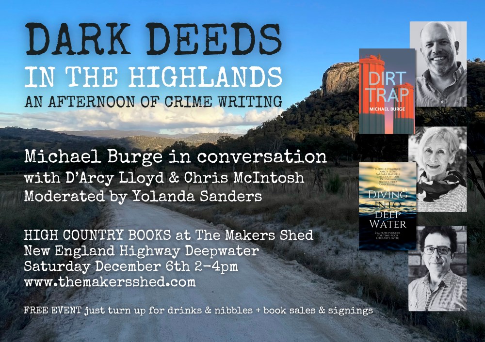 2-4pm: Dark Deeds in the Highlands, an afternoon of crime writing. Authors Michael Burge, D’Arcy Lloyd and Chris McIntosh in conversation with Yolanda Sanders. No booking required, just turn up!
