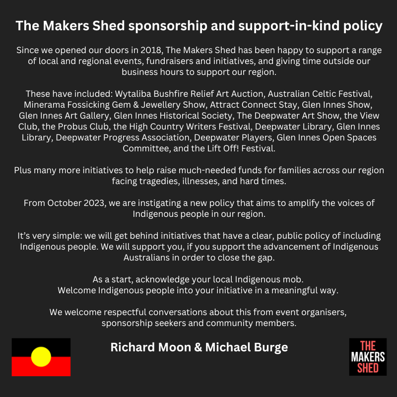 Silverworker Richard Moon and author/journalist/artist Michael Burge started our business at home in outer Brisbane in 2014. We traded at markets and festivals for four years, then opened a studio gallery on the high street of Glen Innes, NSW in November, 2018. In 2024, we moved this business to the New England Highway in our hometown Deepwater, NSW. Check out this article Michael wrote about our journey.